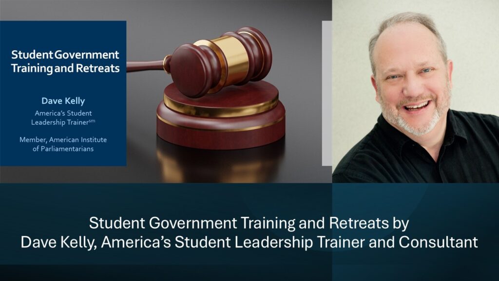 Here are the titles of Dave’s student government specific programs and sessions, along with Learning Outcomes (also check out Club and Organization Leadership Training topics to round out your student government training):